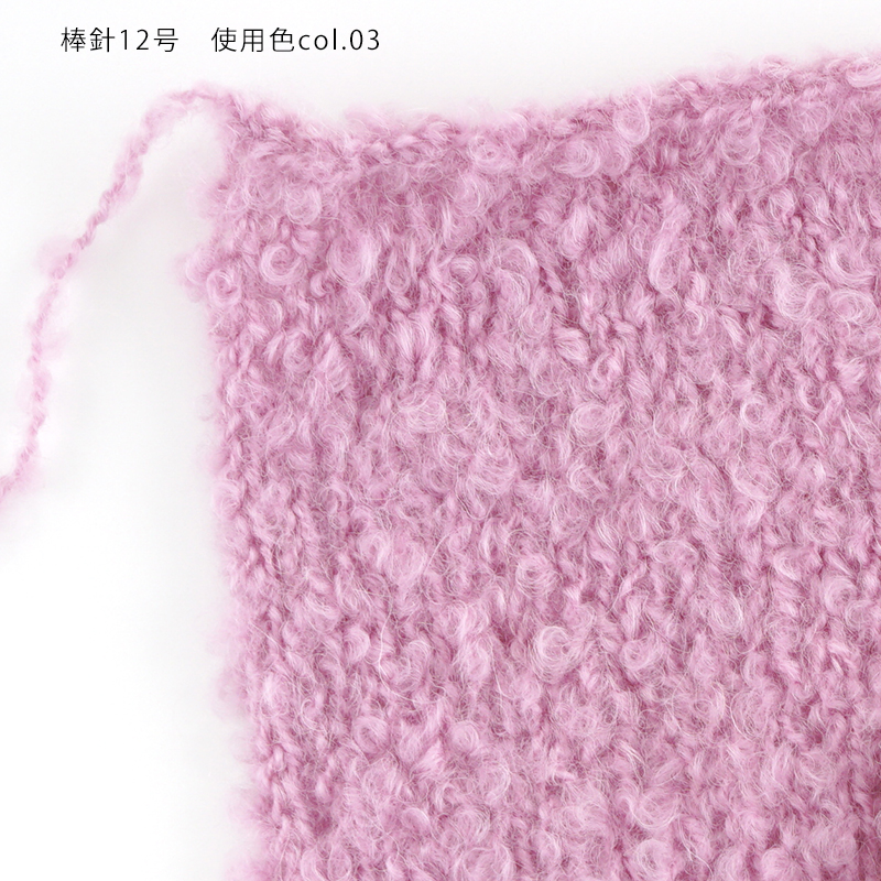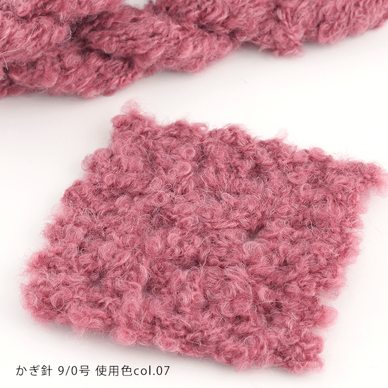 編み地見本、作品サンプルはイメージです。段染め、ミックス、グラデーションなど1玉に複数のカラーを含む糸は編み幅・模様や編み方・玉によって、色・柄の出方は様々です。編地見本・作品サンプル画像とは異なる場合もございます事、ご了承ください。