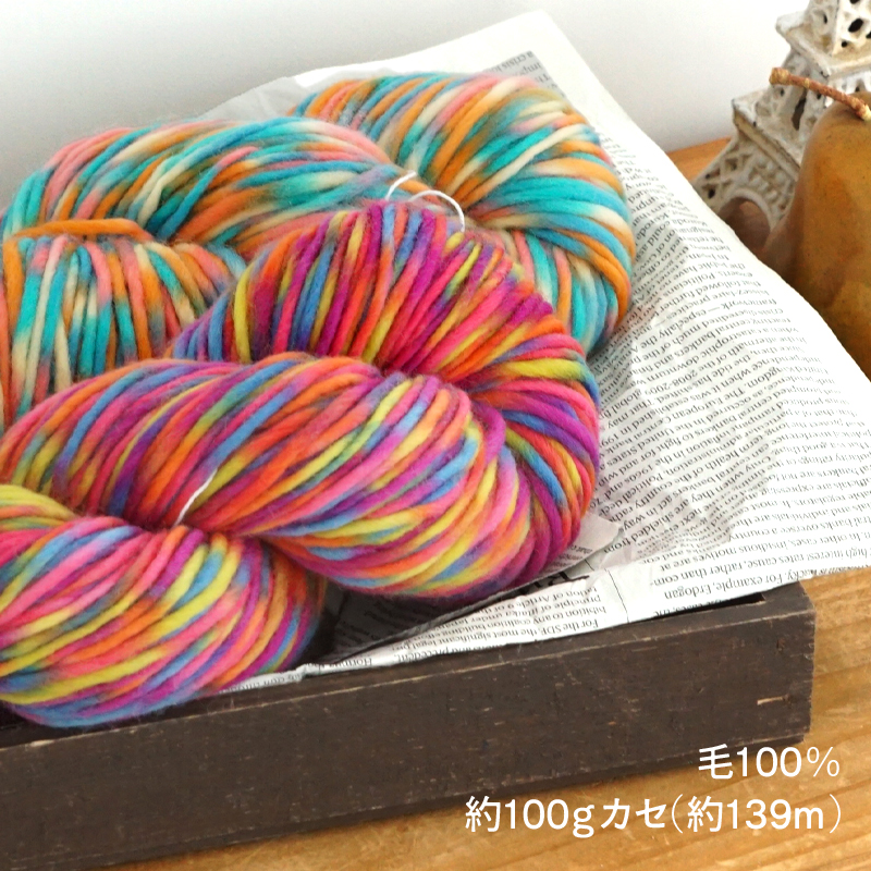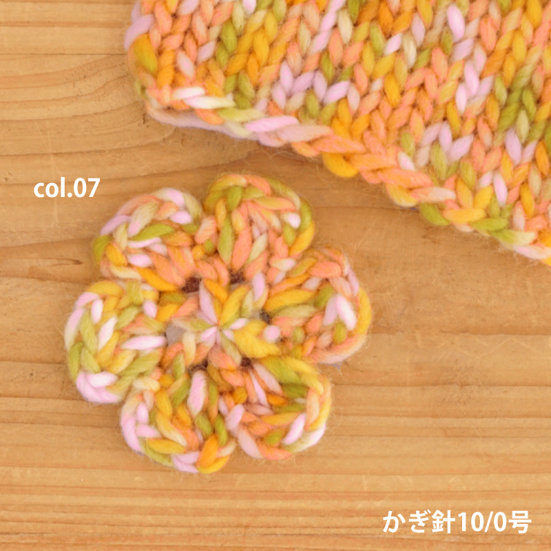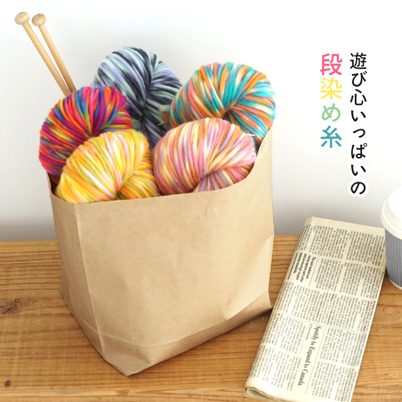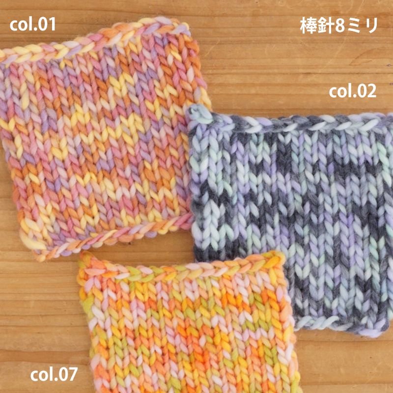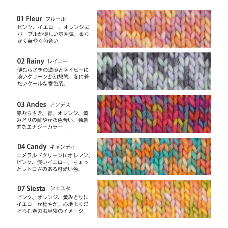 編み地見本、作品サンプルはイメージです。段染め、ミックス、グラデーションなど1玉に複数のカラーを含む糸は編み幅・模様や編み方・玉によって、色・柄の出方は様々です。編地見本・作品サンプル画像とは異なる場合もございます事、ご了承ください。