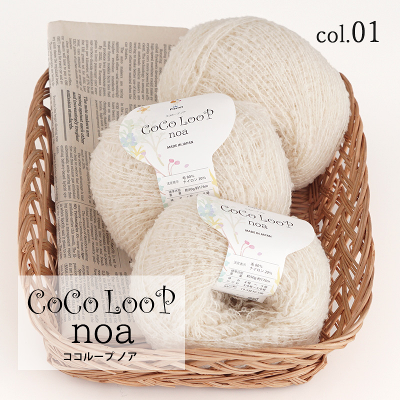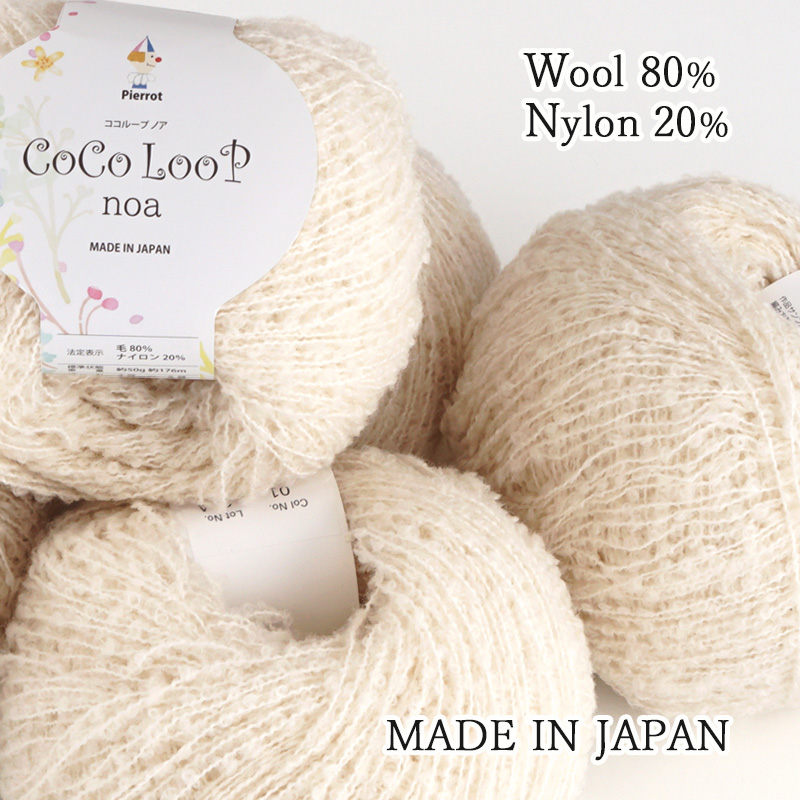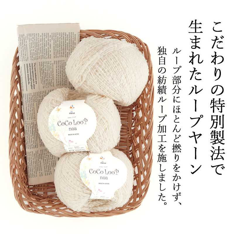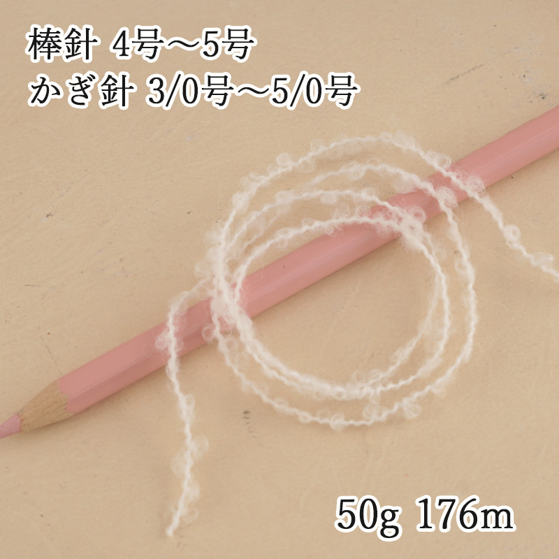 細めの芯糸に小さなループがランダムにあらわれる、こだわりの製法で撚られた特別なループヤーンです。メリノウールを使用しています。単体で使用すればほんのり透けるくらいのやや薄手の軽い仕上がりになり、かわいらしさと上品さが絶妙なバランスです。別の糸との引き揃えに使用してもおすすめです。染色をしていない素材の色合いをお楽しみください。